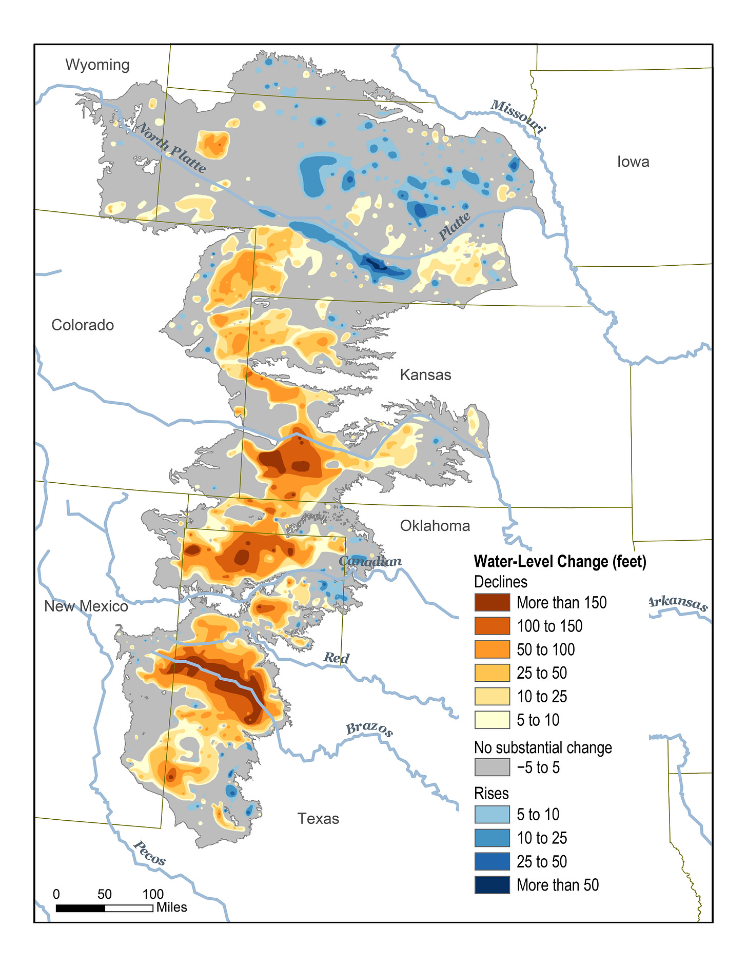 Geology and other factors determine whether the land will follow the water down. In Chicago, for example, the water table beneath the city has dropped some 900 feet, but the urban area is sinking only a couple millimeters per year, and some of that loss is due to other reasons. California’s Central Valley, as I noted, has been sinking like a stone into an empty pond.