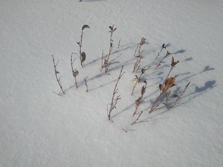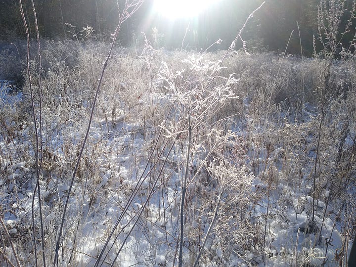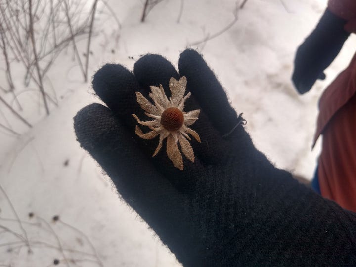Here in Maine, where a field always wants to be forest, an old farm field is both the footprint of destruction - trees felled or burned, perhaps a century or more ago - and a resilient constellation of life. No longer pasture, but still mowed every year or so, the field I’ve made my short pilgrimages to this winter is a beautiful artifact. Beneath the snow is an intricate tangle of last year’s grasses, sedges, and flowers. At our previous home, Heather and I documented 93 flowering plants in a similar but smaller field. The more details of life we saw in that field, the more we realized we weren’t seeing, and would never see. A field is a tattered scrap of fabric that speaks to the wholecloth that contains us all.