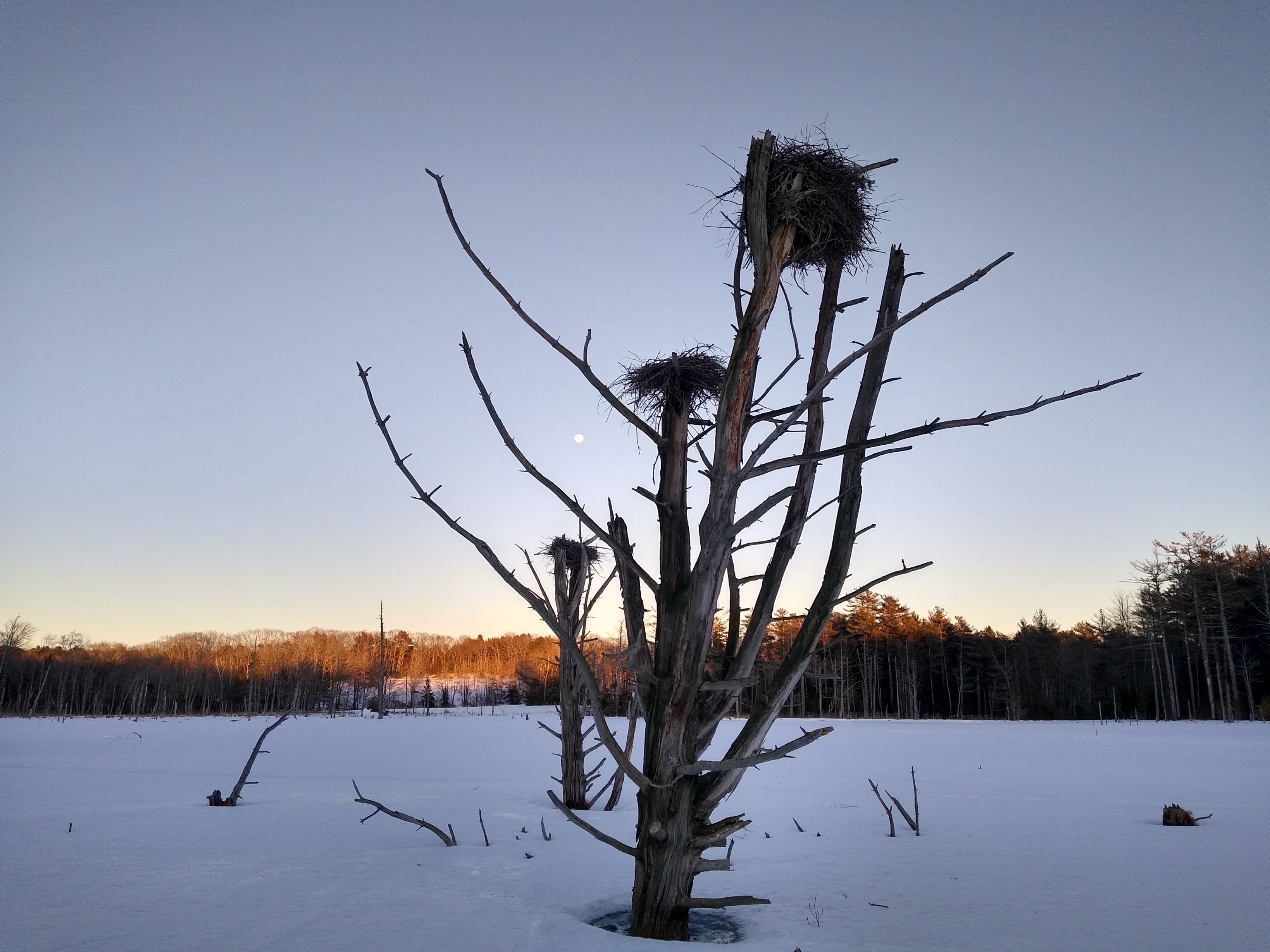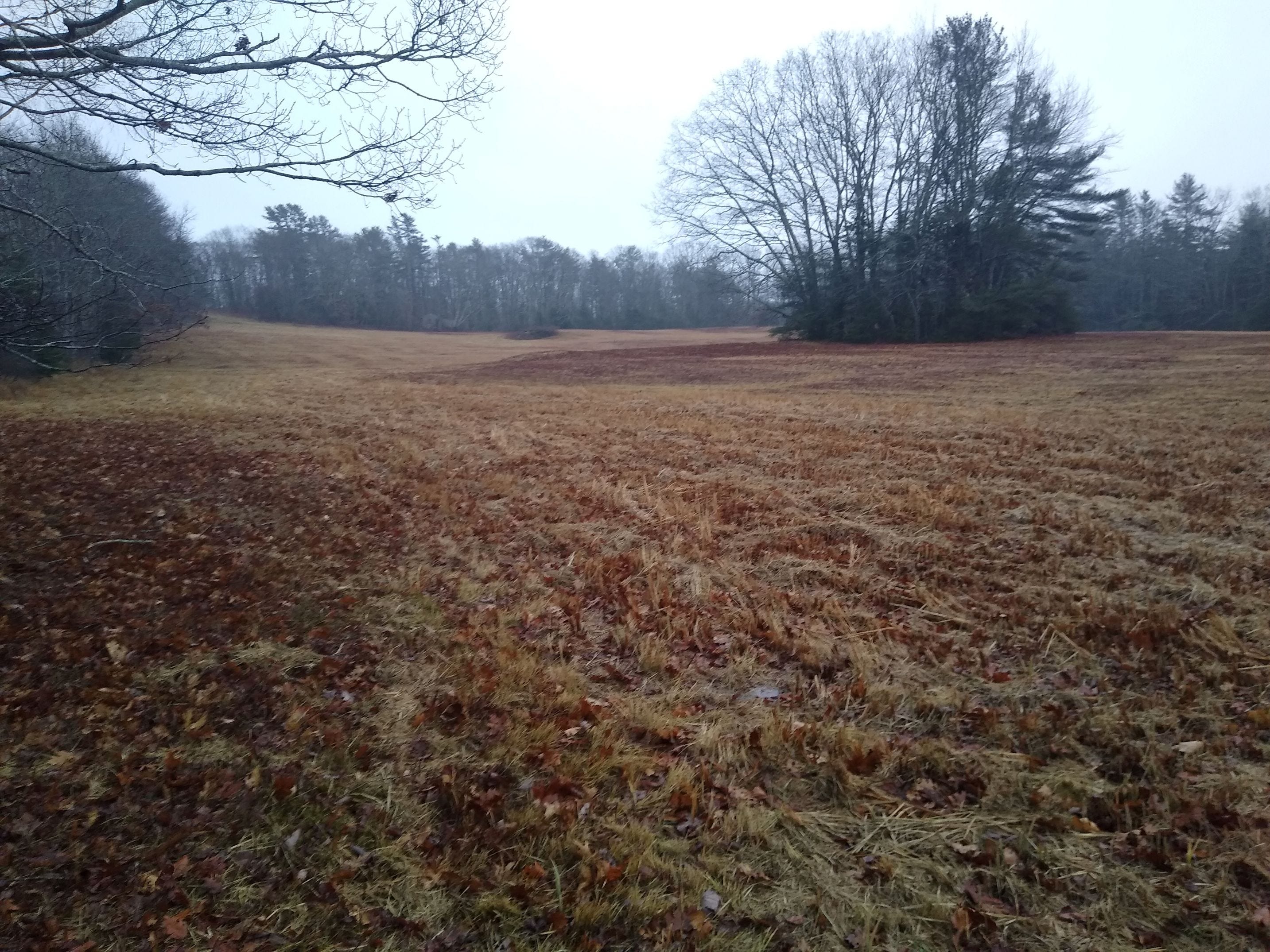 The beaver/heron pond lies at the bottom of a large and noble sloping field, surrounded by undeveloped forest and overseen by an old neglected farmhouse perched atop the hill. An old colonial road, now a forest path, runs nearby. There’s an island of pine, maple, and birch in the lower field, standing tall in what was recently a thick blanket of snow.