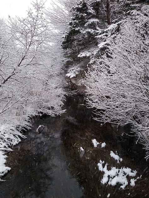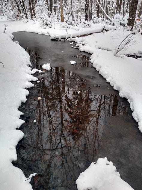 The deep snow and the necklace of frozen wetlands remind me that winter is a revelation about the physics behind biology. Flora and fauna are only characters in the story of a planet spinning and tilting in its orbit. Water, vapor, snow, ice: The fate of water, in this story of flux and flow, defines the fate of its characters. I’ve always felt that following a stream is a profound narrative, because it is both ordinary and a path to joy. And a winter following feels more profound, in part because the starkness of winter lays bare the bones of reality, and in part because I get to walk on water.