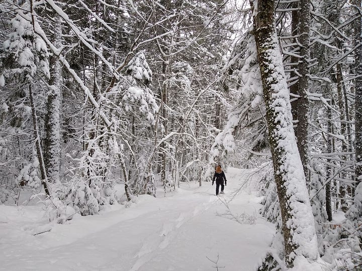 I love walking, skiing, and snowshoeing through forest, keeping company with trees and seeing in the snow-reflected light the extraordinary elegance of lichens mapped onto their trunks. I love how a winter forest provides step-by-step evidence of the paths of other lives - deer, coyote, turkey, squirrel, porcupine, bobcat, otter, fisher, and so many others - and how our tracks are woven into theirs. I love tracing and crossing streams, and walking across the ice of usually impassable bogs and swamps.