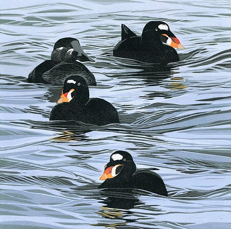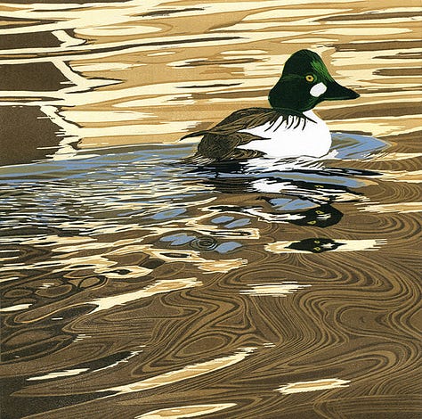 Our friend Sherrie York lives nearby in a small house tucked away on the edge of field and forest, here on one of midcoast Maine’s many peninsulas. In it, she works quietly and very, very patiently on her remarkable linocut prints of birds, flowers, and other natural wonders she encounters on her walks in this wondrous place. I’m particularly fond of her work with birds on the water.